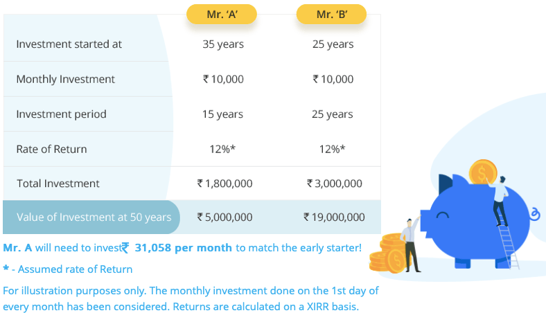 Early investment in SIP also helps the investor to accumulate higher wealth as compared to the person who has started investing later. Let’s understand this with the help of the below example.