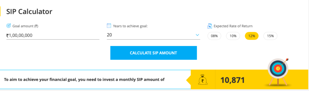 For our example, the investment amount comes out to be ₹ 10871. So I need to invest ₹ 10871 every month for the next 20 years to accumulate the corpus of ₹ 1 Cr. Isn’t it simple and easy? Any 5th standard student can use this calculator effectively.